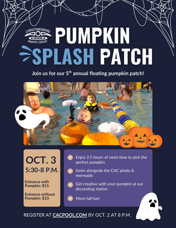 Christiansburg Aquatic Center presents their 5th Annual Pumpkin Splash Patch on Friday, October 3, 2025.