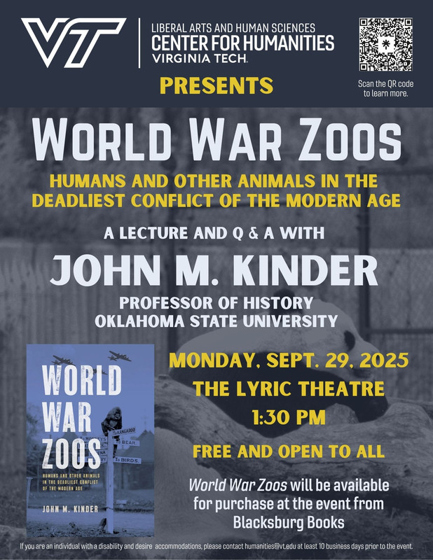 The Center for Humanities at Virginia Tech presents "World War Zoos: Humans and Other Animals in the Deadliest Conflict of the Modern Age," a lecture and Q&A with professor John M. Kinder at The Lyric Theatre on Monday, September 29, 2025.