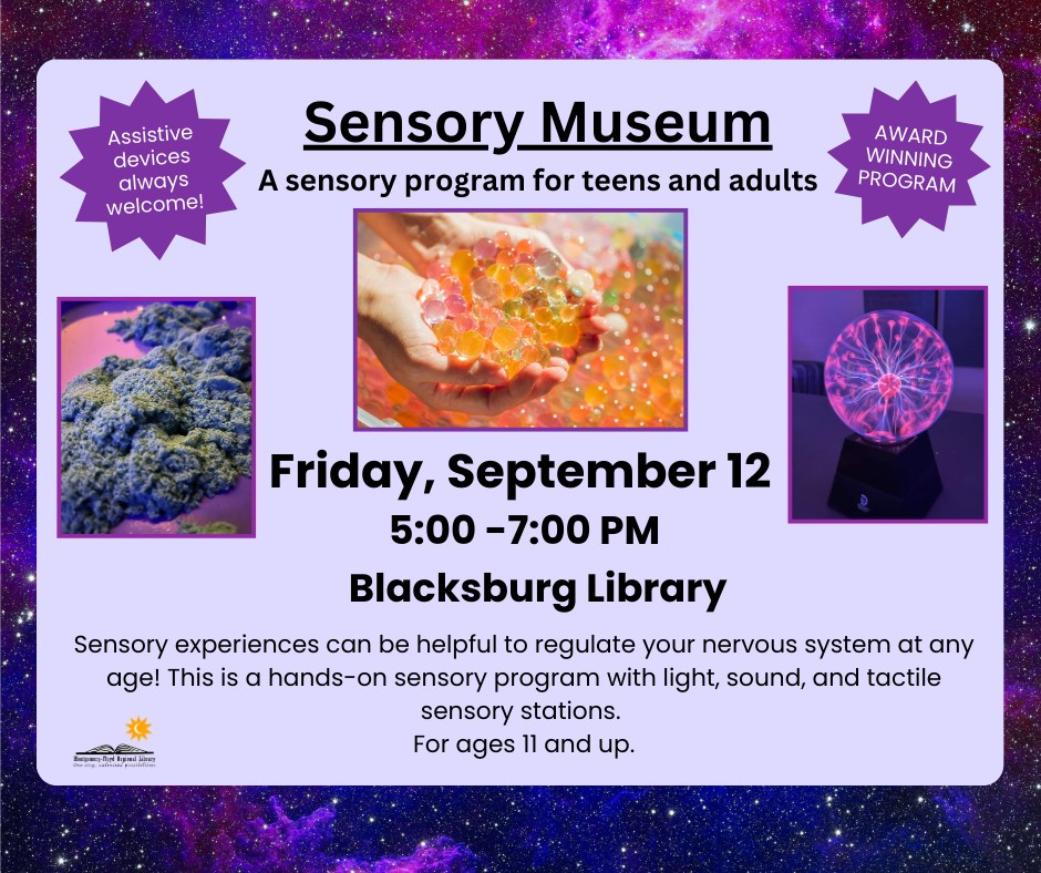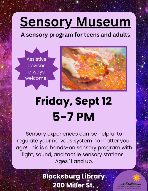 The Blacksburg Library presents a Sensory Museum for Teens & Adults on Friday, September 12, 2025.