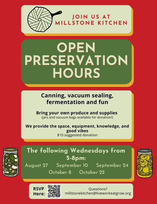 Join us at Millstone Kitchen every other Wednesday from late August to October for Open Preservation Hours with canning, vacuum sealing, fermentation and fun!