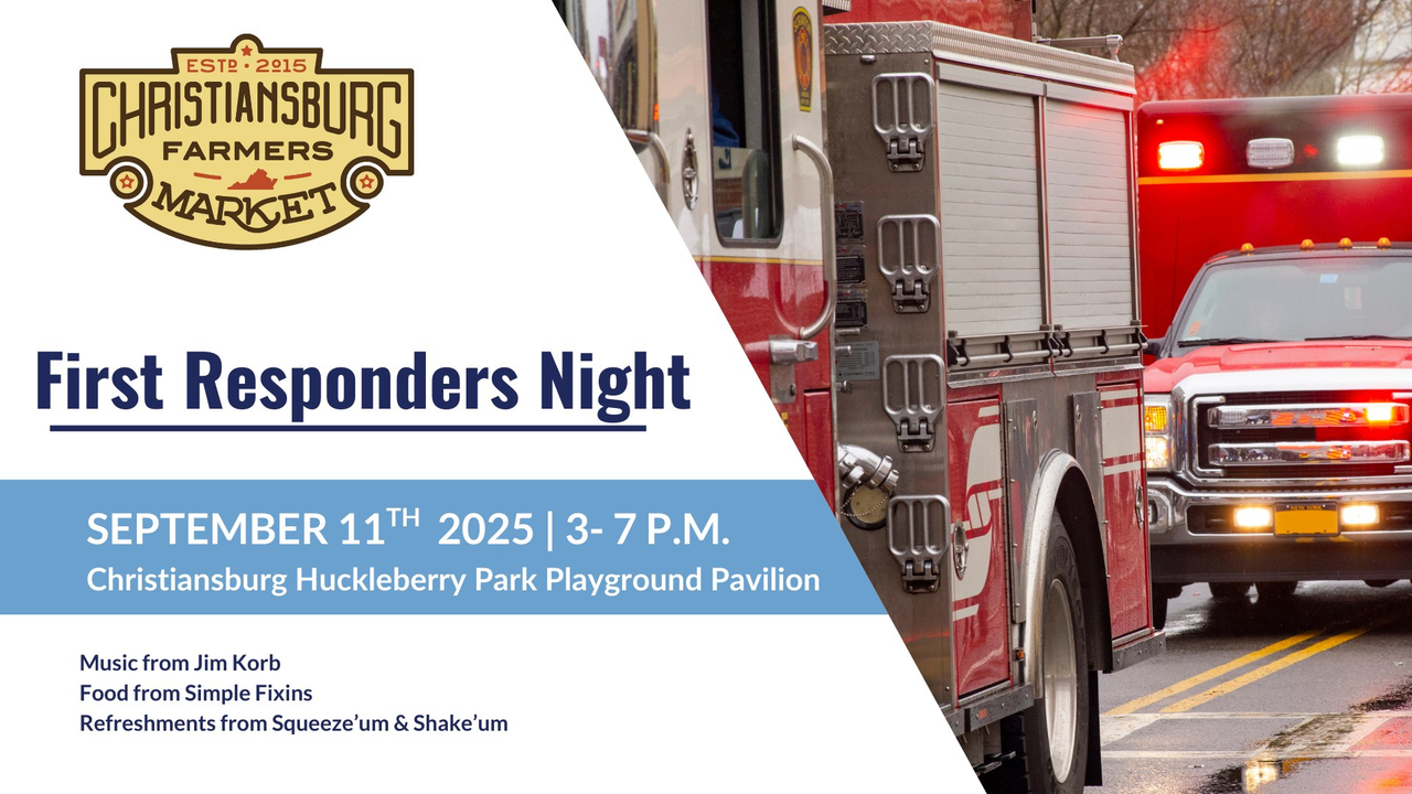The Christiansburg Farmers Market presents their First Responders Night hosts their Weekly Market on Thursday, September 11, 2025 at Huckleberry Park's Playground Pavilion.