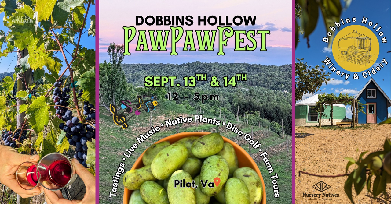 Join the celebration of North America’s largest native fruit! Explore the scenic vineyard grounds, taste fresh pawpaw fruit, and see what all is growing. Featuring live music from the Handmade Music School of Floyd, free pawpaw tastings, farm tours, local food, disc golf, raffles, Blue Ridge Goatscaping, face painting, cider pressing, Wood Thrush Natives, Nursery Natives, and a whole lot more! Their will also be family friendly activities throughout the vineyard and several special libations for the adults.