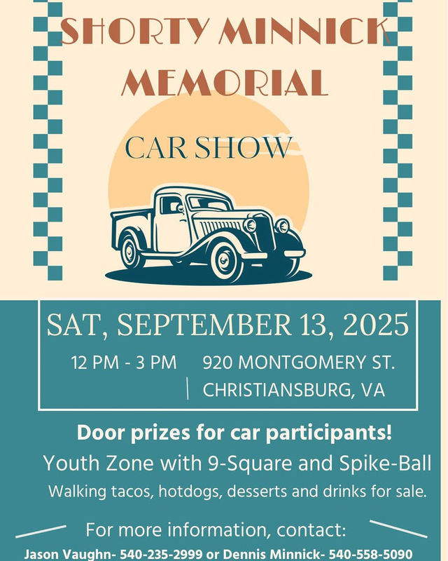All are invited to join the Shorty Minnick Memorial Car Show for cars, food, fellowship and fun! There will be door prizes for car show participants.