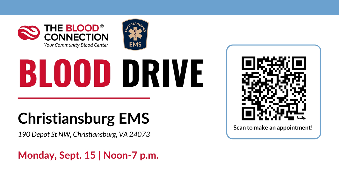 The Christiansburg Rescue Squad hosts their September Blood Drive on Monday, September 15, 2025.