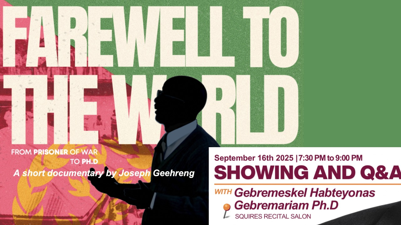"Farewell to the World" is a short documentary by Joseph Geehreng about Gebremeskel Habteyonas Gebremariam, who was captured and imprisoned in 1979 at the age of twelve during one of Eritrea, Africa’s most turbulent eras.