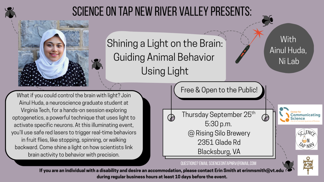 What if you could control the brain with light? Join Ainul Huda, a neuroscience graduate student at Virginia Tech, for a hands-on session exploring optogenetics, a powerful technique that uses light to activate specific neurons. At this illuminating event, you’ll use safe red lasers to trigger real-time behaviors in fruit flies, like stopping, spinning, or walking backward.