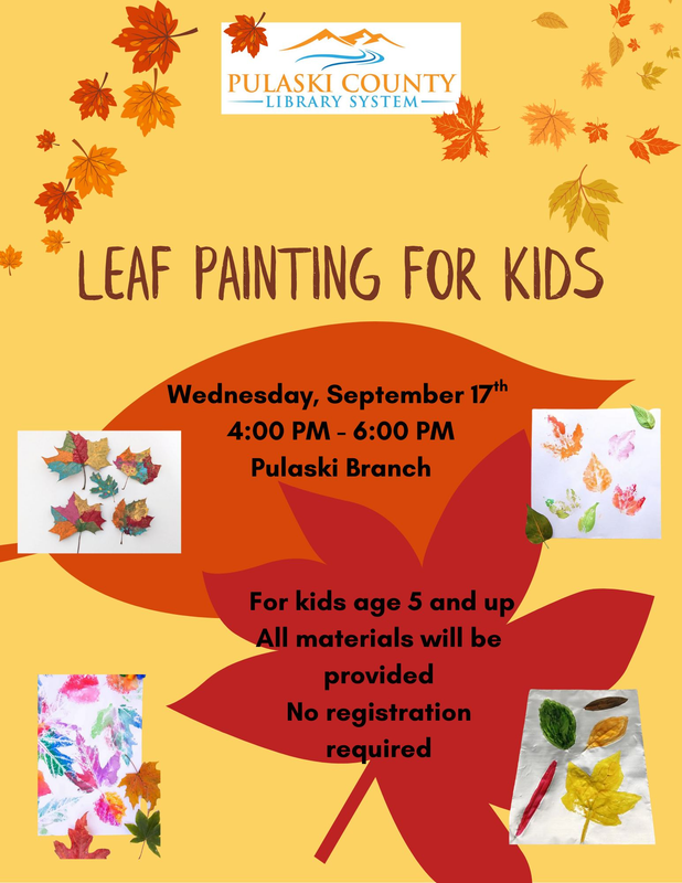 The Pulaski County Library presents Leaf Painting for Kids on Wednesday, September 17, 2025.