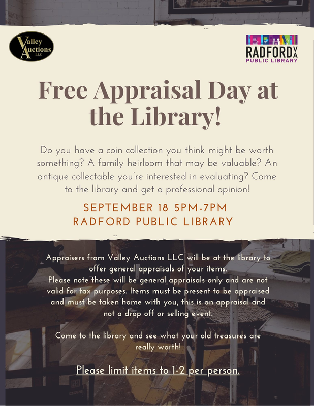 The Radford Public Library presents a Free Appraisal Day at the Library on Thursday, September 18, 2025.