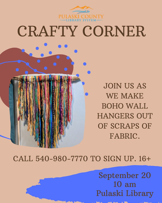 The Pulaski County Library continues their monthly "The Crafty Corner" series for September with the craft "Boho Wall Hangers" on Saturday, September 20, 2025.
