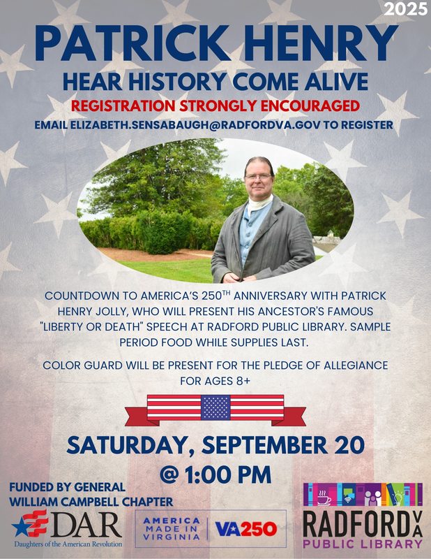 The Radford Public Library presents the program "Hear History Come Alive with Patrick Henry" on Saturday, September 20, 2025.