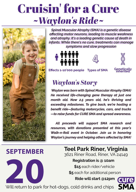 We’re inviting everyone to join us for Cruisin’ for a Cure Waylon’s Ride, a benefit ride where every cent raised will be donated directly to Cure SMA. All proceeds will support SMA research and resources, with donations presented at this year's Walk-n-Roll event in October.