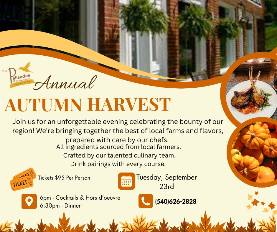 The Palisades Restaurant presents their Annual Autumn Harvest Dinner on Tuesday, September 23, 2025.