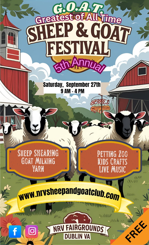 The New River Valley Sheep and Goat Club presents the 5th Annual G.O.A.T (Greatest of All Time) Sheep and Goat Festival on Saturday, September 27, 2025 at the New River Valley Fairgrounds in Dublin, VA.