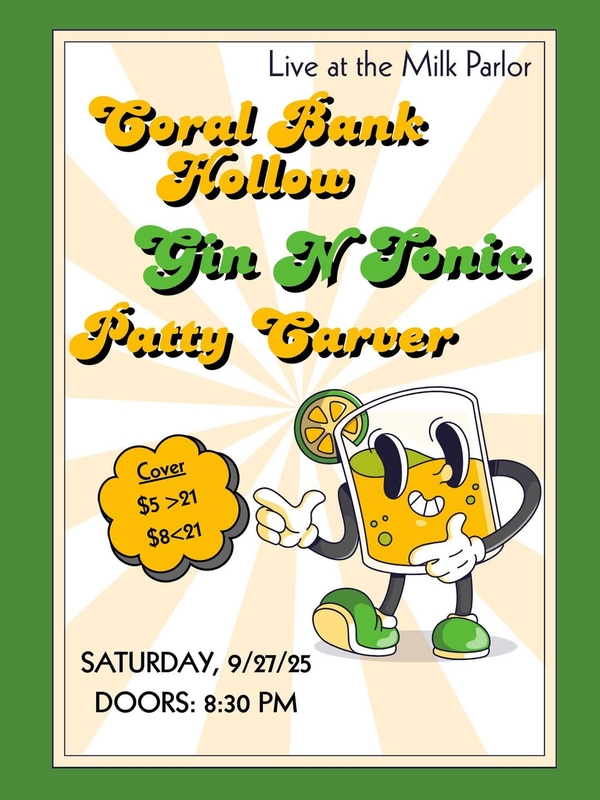 The Milk Parlor presents a Three Band Concert with Coral Bank Hollow, Gin N Tonic and Patty Carver Band on Saturday, September 27, 2025.