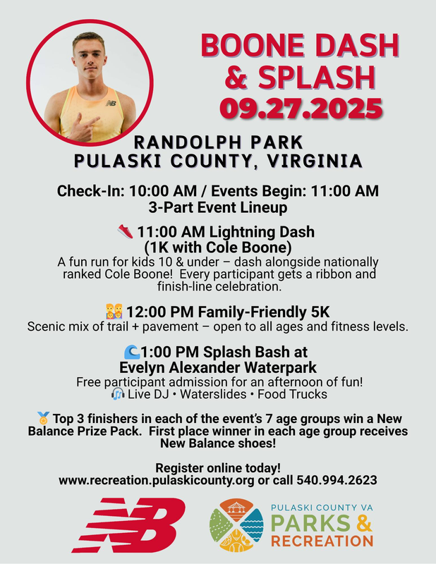 Pulaski County Parks & Recreation presents the Boone Dash & Splash on Saturday, September 27, 2025 at Randolph Park in Dublin, VA.