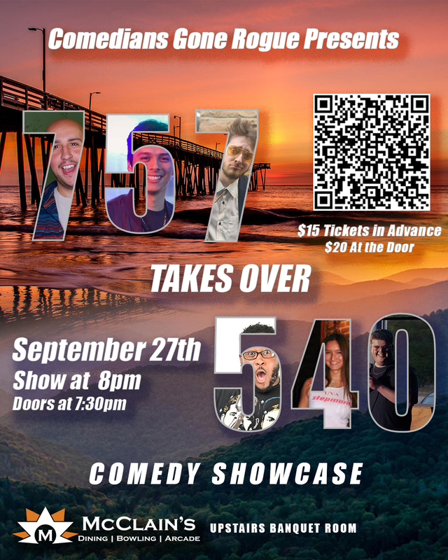 Comedians Gone Rogue presents the 757 Takes Over the 540 Stand Up Comedy Show on Saturday, September 27, 2025 in the Upstairs Banquet Room at McClain's at First & Main in Blacksburg, VA.