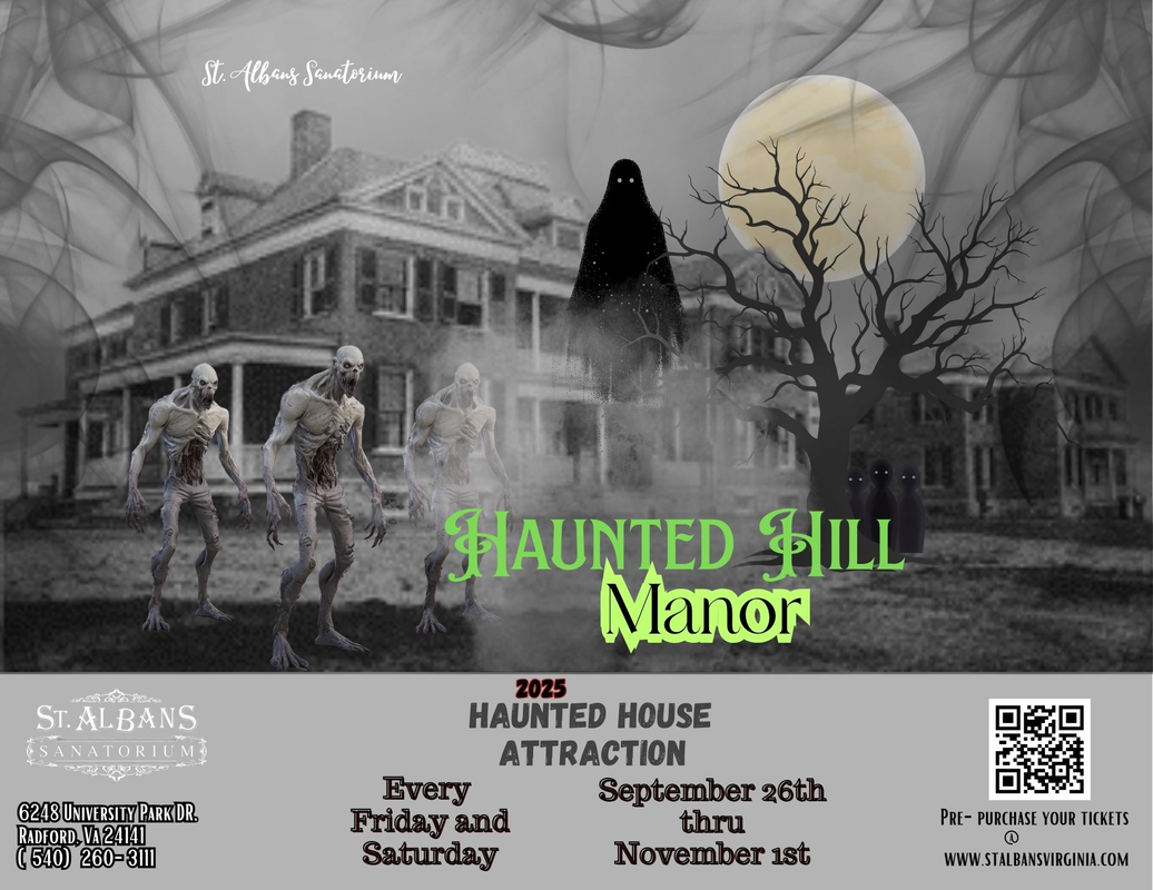 St. Albans presents the Haunted Hill Manor Haunted House Attraction opened every Friday and Saturday from 7:00-11:30 PM each night starting on Friday, September 26, 2025 through Saturday, November 1, 2025.