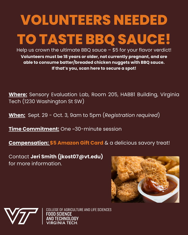 The Virginia Tech Sensory Evaluation Lab requests Volunteers Needed to Taste BBQ Sauce starting on Monday, September 29, 2025 through Friday, October 3, 2025 from 9:00 AM to 5:00 PM each day.