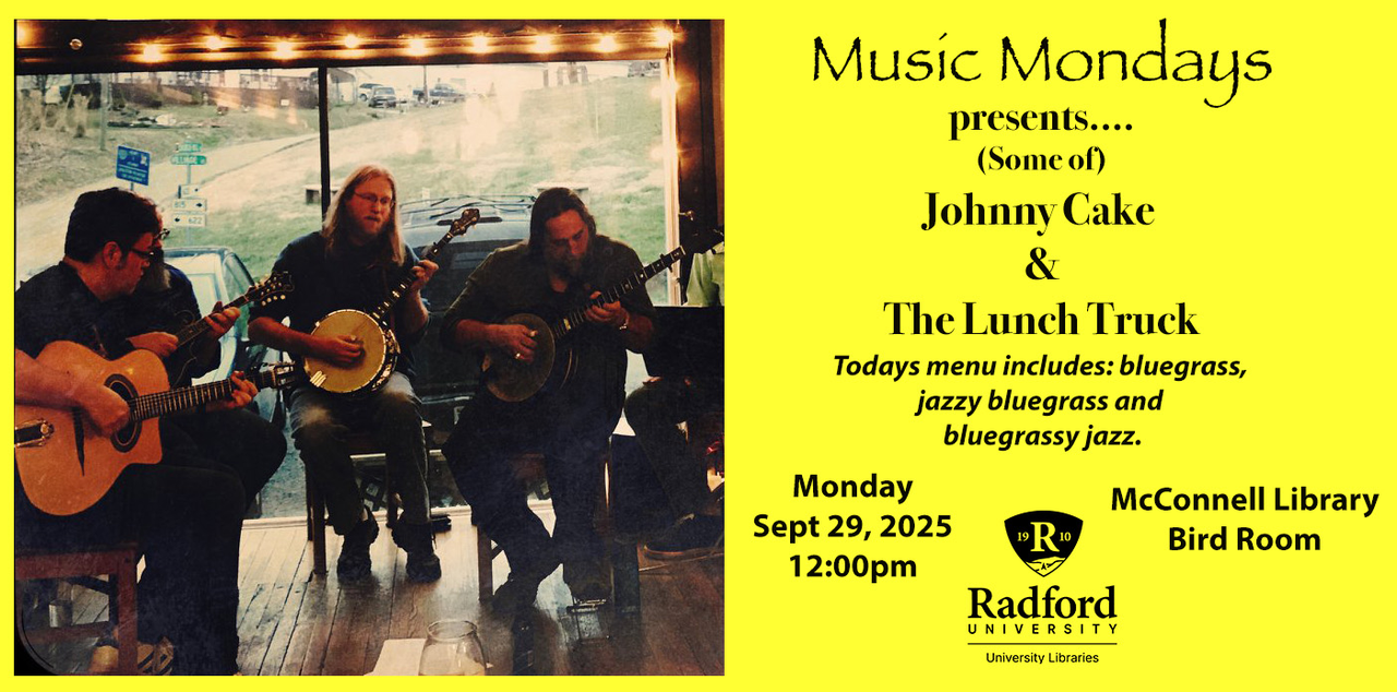 The McConnell Library, on the campus of Radford University, kicks off their Fall 2025 Semester Music Mondays series with Johnny Cake & The Lunch Truck on Monday, September 29, 2025 inside the Bird Room.
