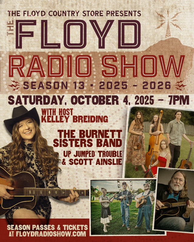 The Floyd Country Store presents The Floyd Radio Show Season 13 Kickoff with The Burnett Sisters Band, Up Jumped Trouble and Scott Ainslie on Saturday, October 4, 2025.