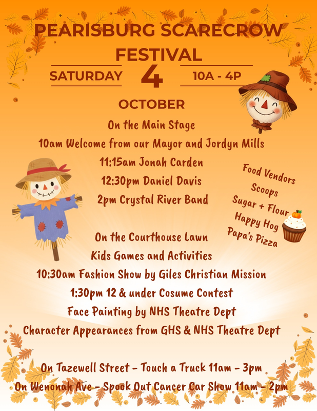The Pearisburg Merchants Association presents the 10th Annual Pearisburg Scarecrow Festival on Saturday, October 4, 2025 on Wenonah Avenue and Tazewell Streets in downtown Pearisburg, VA.