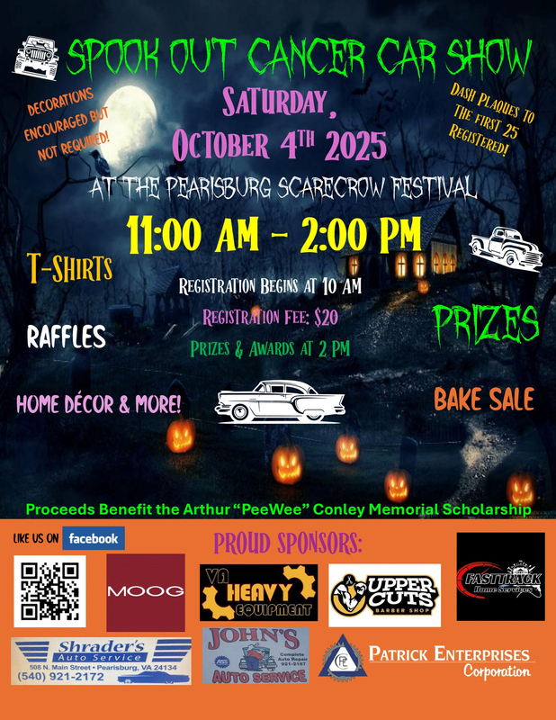 https://www.reverbnation.com/jonahcardenThe Spook Out Cancer Car Show is open to all cars with dash plaques given out to the first 25 vehicles registered. The registration fee is $20.00 per vehicle. Registration is open from 10:00-11:00 AM and the show begins at 11:00 AM. The public will vote on their favorite rides and trophies will be awarded for each category. Halloween decorations are encouraged, but not required. Prizes and awards will be handed out at 2:00 PM. There will also be raffles, bake sale and t-shirts available for purchase. Proceeds from the car show benefit The Arthur "Peewee" Conley Memorial Scholarship.