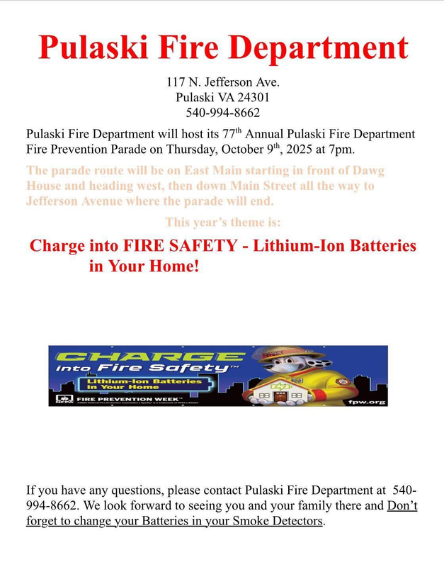 The Pulaski Fire Department presents the 77th Annual Pulaski Fire Department Fire Prevention Parade on Thursday, October 9, 2025 in downtown Pulaski, VA.