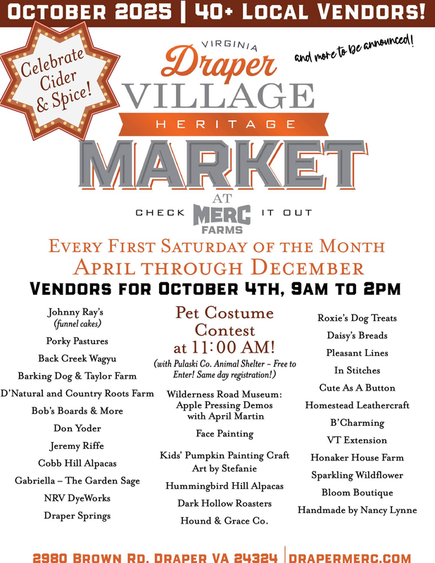 Located in the heart of Draper, VA, the Draper Village Heritage Market is a vibrant gathering place that celebrates our community’s rich heritage, craftsmanship, and agricultural roots. Experience the best of local arts, crafts, and food while enjoying workshops, hands-on demonstrations, and interactive exhibits that honor traditions and promote sustainable living. Join us to grow roots, get grounded, and embrace the spirit of community and culture that defines Draper Village. The Heritage Market will be held on the first Saturday of the month from April through December.