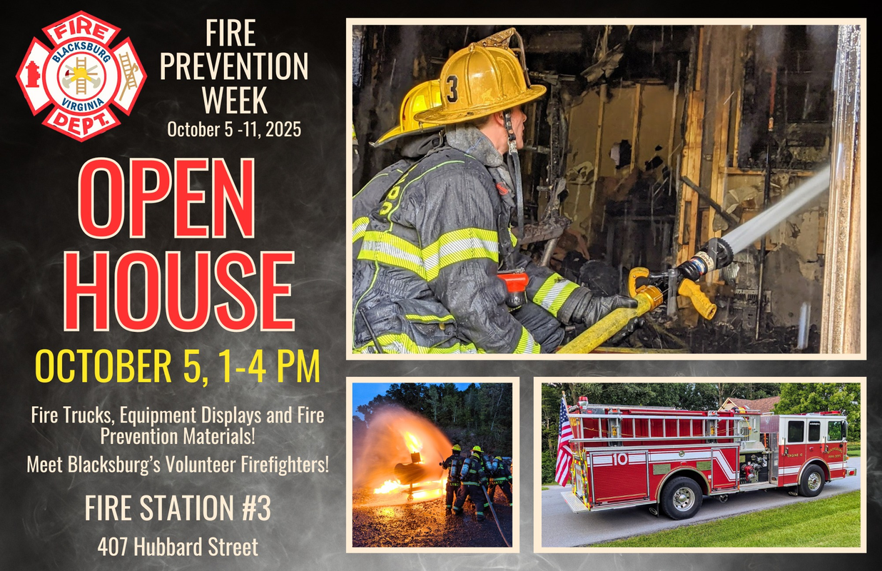 The Blacksburg Volunteer Fire Department presents their annual Fire Prevention Week Open House on Sunday, October 5, 2025 at Fire Station #3.