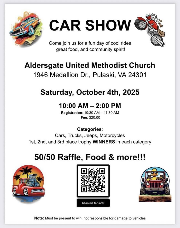 Aldersgate United Methodist Church presents a Fall Car Show on Saturday, October 4, 2025.