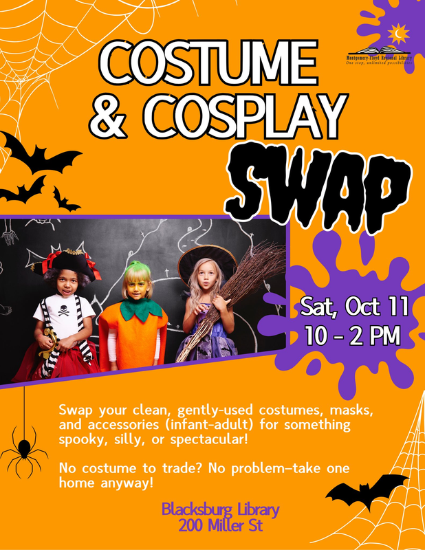 The Blacksburg Library presents a Costume & Cosplay Swap on Saturday, October 11, 2025.