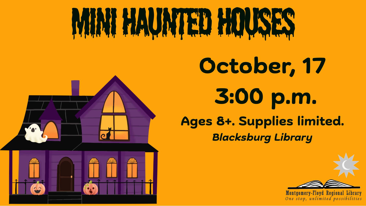 The Blacksburg Library presents Mini Haunted Houses for Ages 8 & Up on Friday, October 17, 2025.