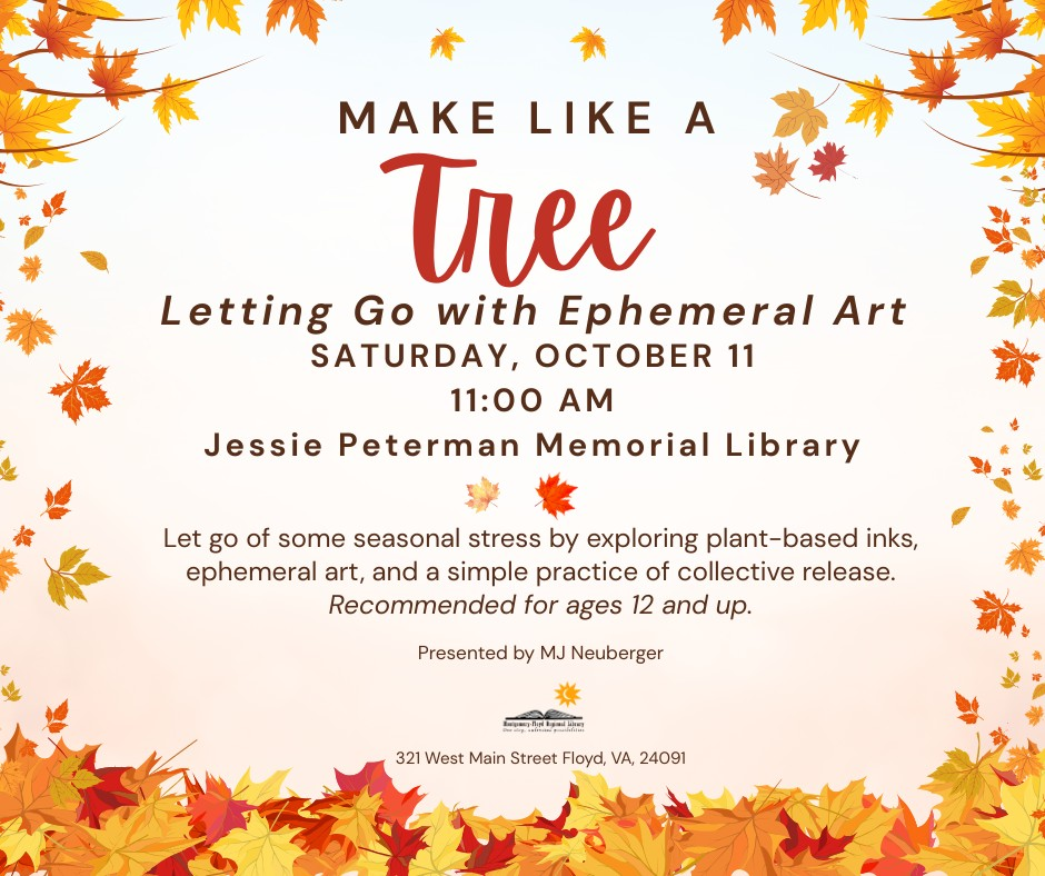 The Jessie Peterman Library presents the craft "Make Like a Tree: Letting Go with Ephemeral Art" on Saturday, October 11, 2025.