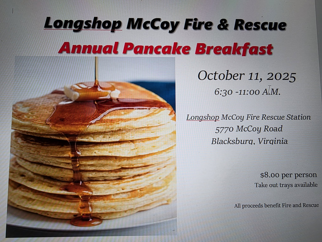Enjoy a great pancake breakfast with pancakes, bacon, sausage, coffee, juice and water with all proceeds benefitting the Longshop-McCoy Volunteer Fire Rescue!