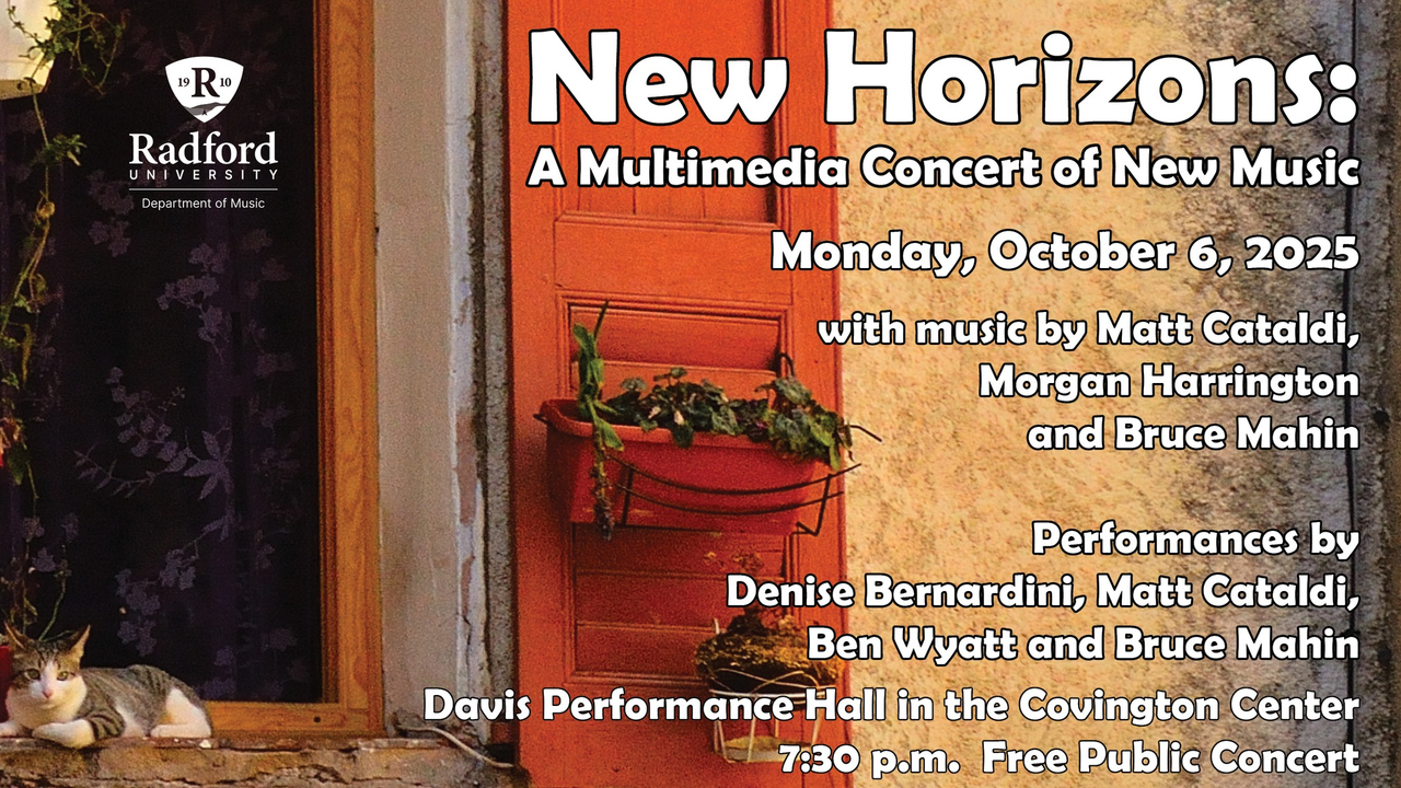 Radford University College of Visual & Performing Arts presents "New Horizons: A Multimedia Concert of New Music" on Monday, October 6, 2025 in Performance Hall located within the Covington Center on the campus of Radford University.