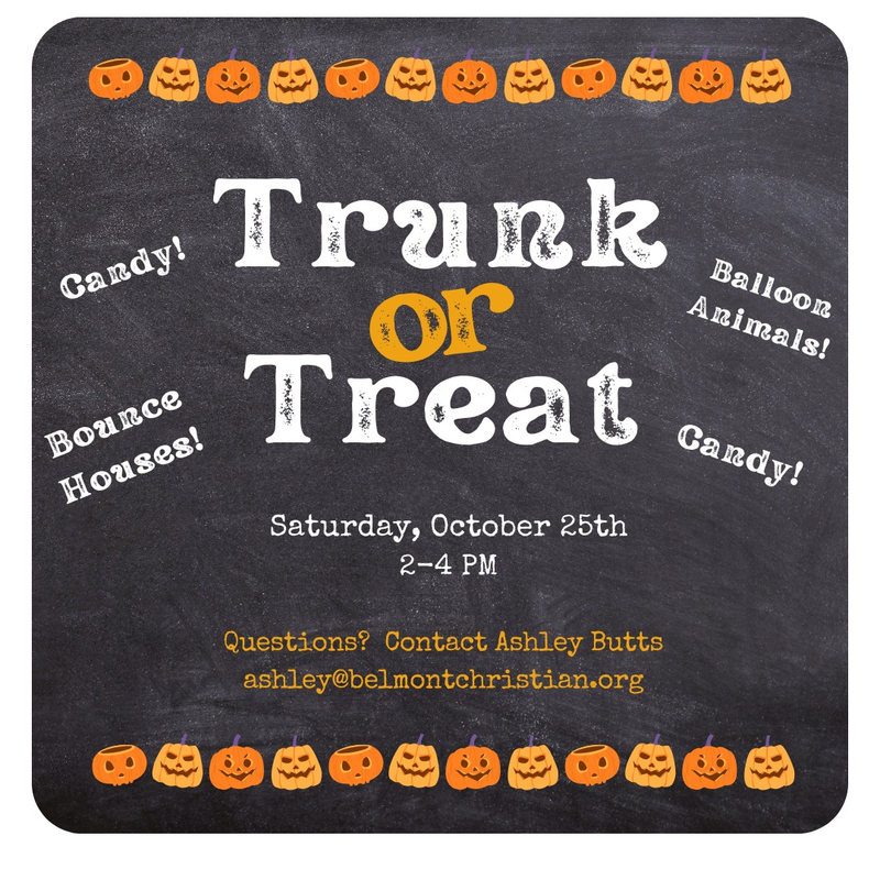 Belmont Christian Church presents their 2025 Trunk or Treat on Saturday, October 25, 2024.