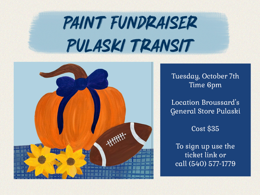 Broussard's General Store and Creative Canvas of the NRV presents Paint Night Fundraiser for the Pulaski Transit on Tuesday, October 7, 2025.