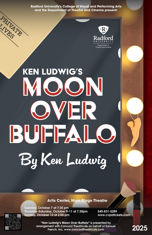 Radford University College of Visual & Performing Arts and Department of Theatre & Cinema present the classic American farce / comedy "Moon Over Buffalo" with five performances starting on Tuesday, October 7, 2025 through Sunday, October 12, 2025 inside the Artis Center Main Stage Theatre on the campus of Radford University.
