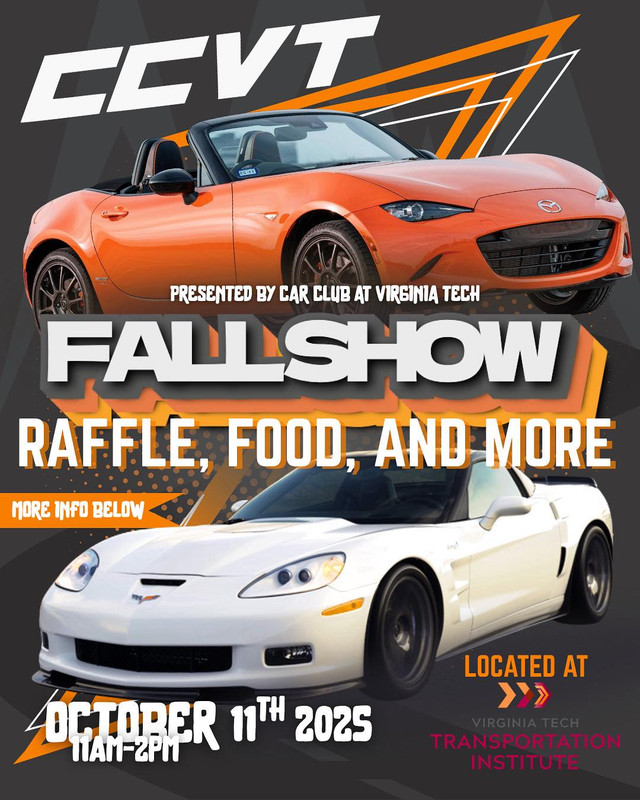 The Car Club at Virginia Tech (CCVT) presents their 2025 Fall Car Show on Saturday, October 11, 2025 in the parking lot at the Virginia Tech Transportation Institute in Blacksburg, VA.