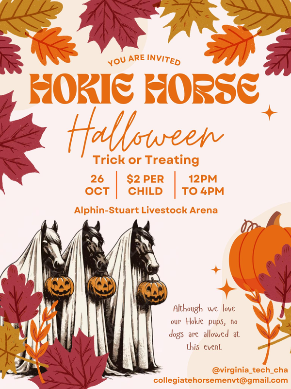 The Collegiate Horsemen's Association at Virginia Tech presents the Hokie Horse Halloween on Sunday, October 26, 2025 at Alphin-Stuart Arena in Blacksburg, VA.