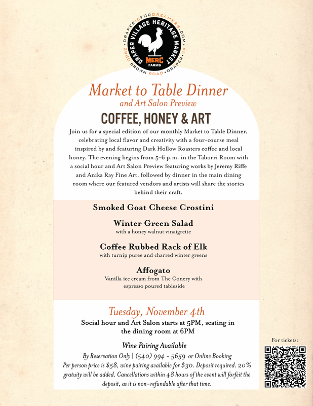 Each month we feature a vendor from our Heritage Market in a chef prepared dinner. Join us for our Coffee & Honey dinner featuring Dark Hollow Coffee Roasters and Draper Honey. This elegant four course meal shines a light on local ingredients.