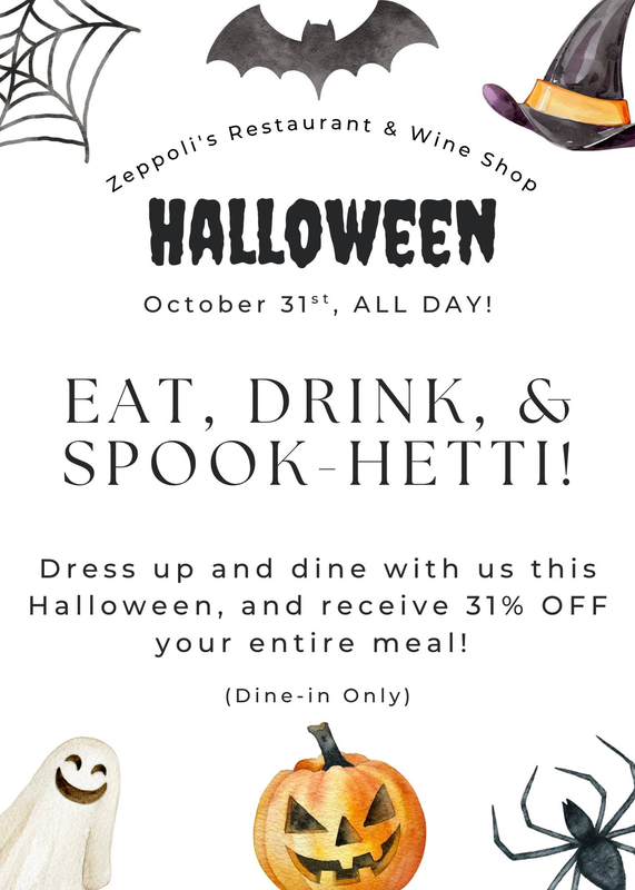 Eat, drink, and Spook-hetti! Gather your ghoul-friends for a wickedly good time at Zeppoli's this Halloween! Join us in celebrating a boo-zy holiday and enjoy 31% off your meal when you dress up and dine-in with us on Halloween, available all day!