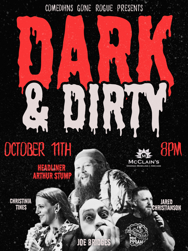 Celebrate spooky season with a Dark & Dirty Comedy Night with four intense comedians coming together for one night to make you hilariously horrified! Featuring: Arthur Stump, Joe Bridges, Jared Christianson and Christinia Tynes!