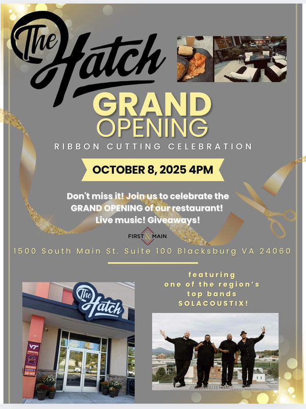 The Hatch Blacksburg presents their Grand Opening and Ribbon Cutting with Solacoustix in concert on Wednesday, October 8, 2025.