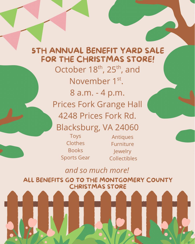 The Prices Fork Grange presents their 5th Annual Benefit Yard Sale for the Montgomery County Christmas Store, a three consecutive Saturday event starting on Saturday, October 18, 2025 through Saturday, November 1, 2025 from 8:00 AM to 4:00 PM each day.
