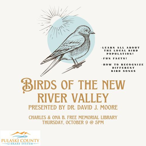 Join us at our Dublin branch for a presentation on the various birds here in the New River Valley! Learn about the local bird population, fun facts, how to recognize different bird songs, and enjoy an app demonstration!