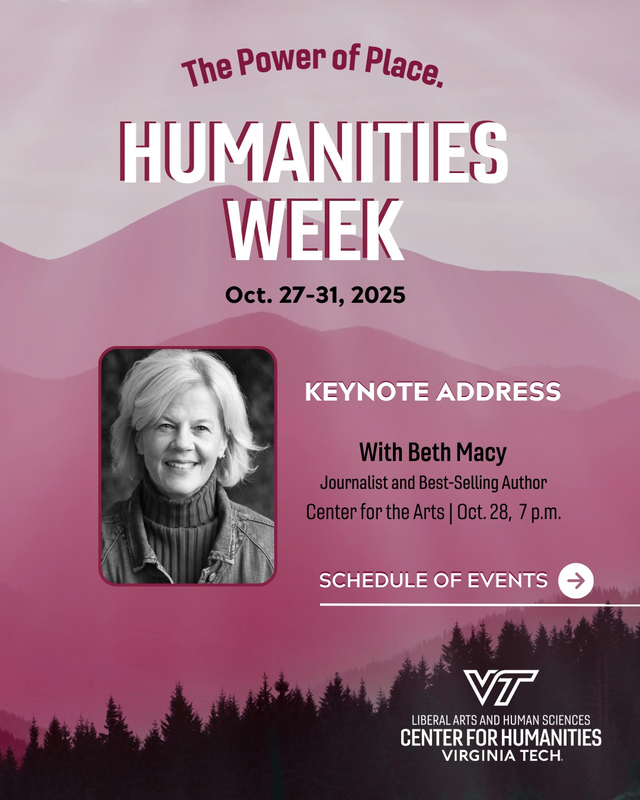 Beth Macy, journalist and best-selling author will present the Virginia Tech Humanities Week keynote address. In this talk, based on Beth Macy's 2025 memoir "Paper Girl", she presents a gift of courage, empathy, and insight to audiences. Learn how Beth Macy turned to face the darkness in her family and community, people she loves wholeheartedly, even the ones she sometimes struggles to like. And how, in facing the truth—in person, with respect, she found sparks of human dignity that she has used to light a signal fire of warning, but also of hope.