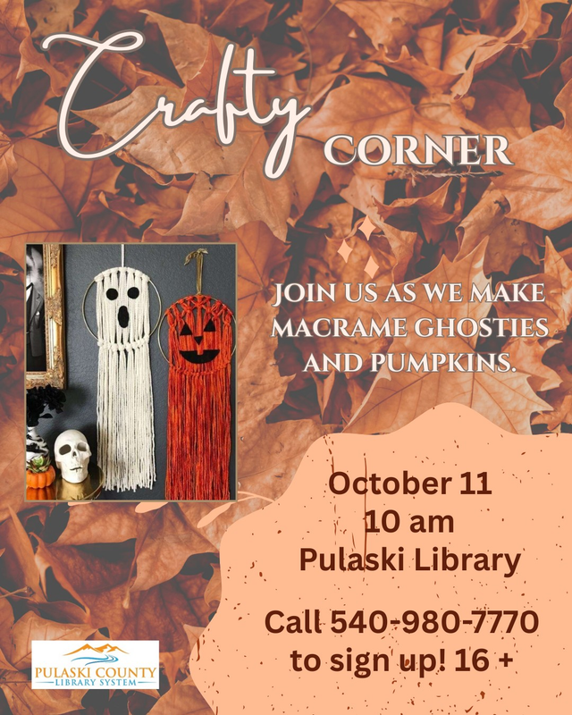The Pulaski County Library continues their monthly "The Crafty Corner" series for October with the craft "Macrame Wall-Hanger Ghosties and Pumpkins" on Saturday, October 11, 2025.