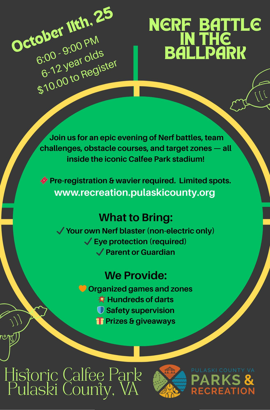 Pulaski County Parks & Recreation presents the Nerf Battle in the Ballpark on Saturday, October 11, 2025 at Calfee Park in Pulaski, VA.