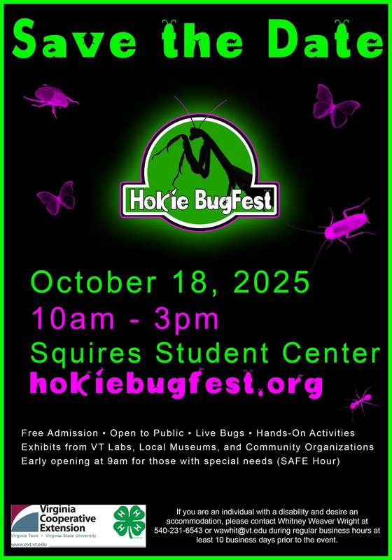 Enjoy live bugs, educational exhibits, and hands-on activities! Hokie BugFest is annual educational event that highlights an ongoing youth education program hosted by the Virginia Tech Department of Entomology, Virginia Tech College of Agriculture & Life Sciences, Virginia Cooperative Extension's 4-H program, and the department's student-run professional organization, the W. B. Alwood Entomological Society.